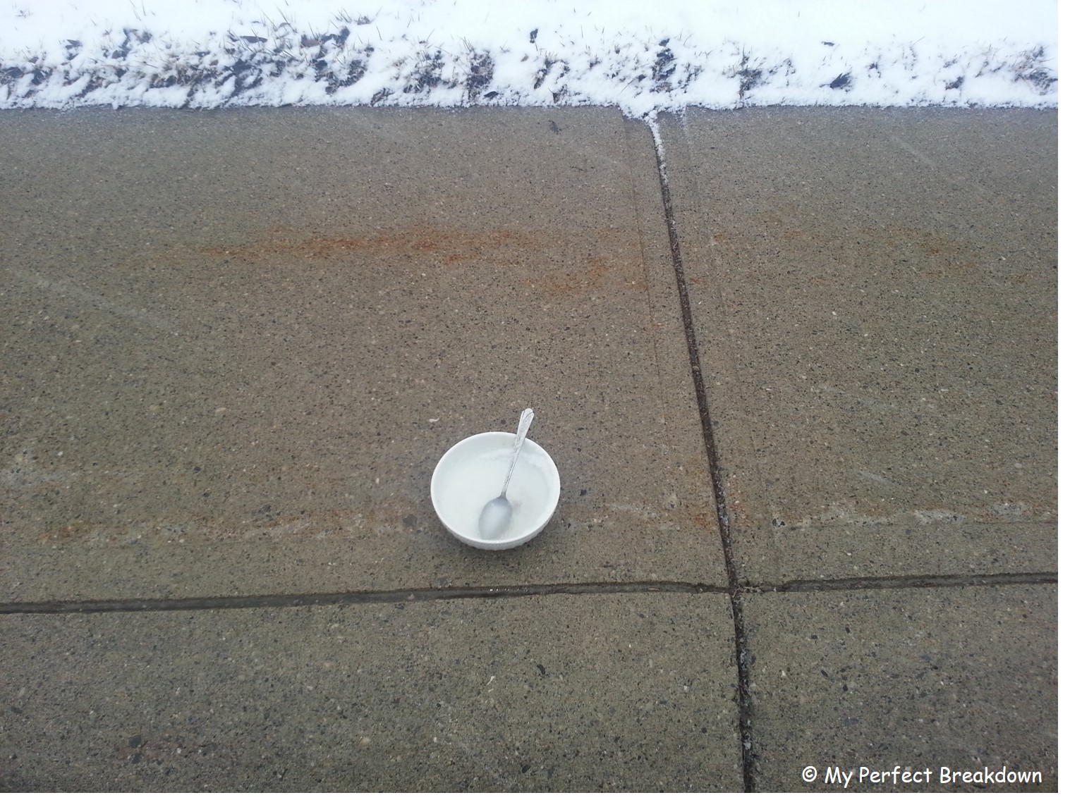 Or maybe, one of my neighbours was late for work. They were in a hurry, so they brought their bowl full of cereal with them to eat on the go. They got close to their car and set the bowl down on the sidewalk, for a quick moment as their arms were full and something was about to fall. And should the bowl of cereal fall, they’d end up wearing milk and corn flakes, then have to run back inside to change. It would have been a mess and made them even later, so setting the bowl down was the smart and easiest thing to do. Then, in the rush and chaos of the morning, they just forgot about it. And there it sat on the sidewalk.