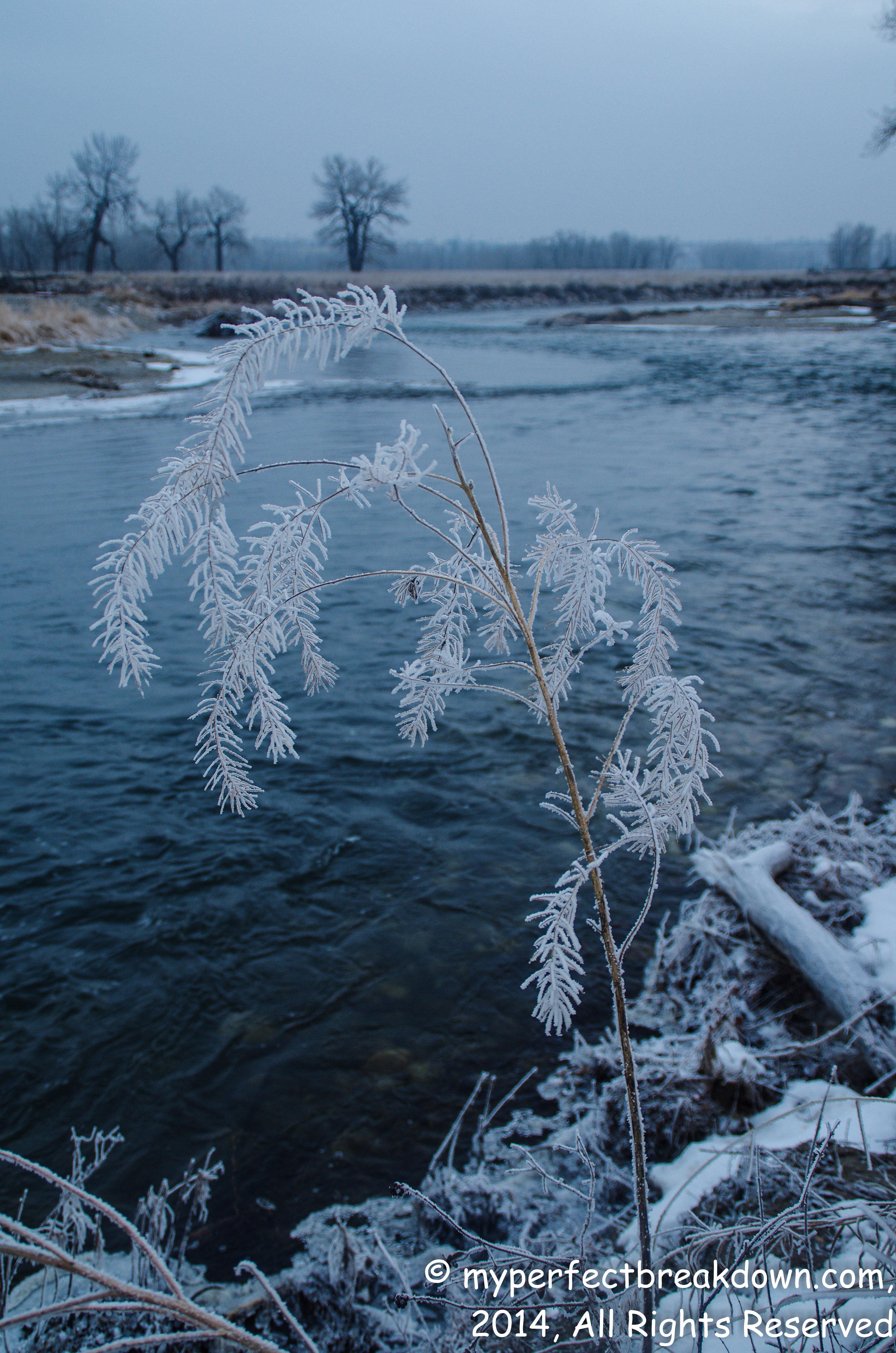 Day 163 – December 16, 2014: Today was a beautiful winter day, the type of day that Frosty the Snowman dreams of. The type of day where moisture hangs from the tress and shimmers and shines. So, Mr. MPB humoured me and we went down to the river to get a few photos.