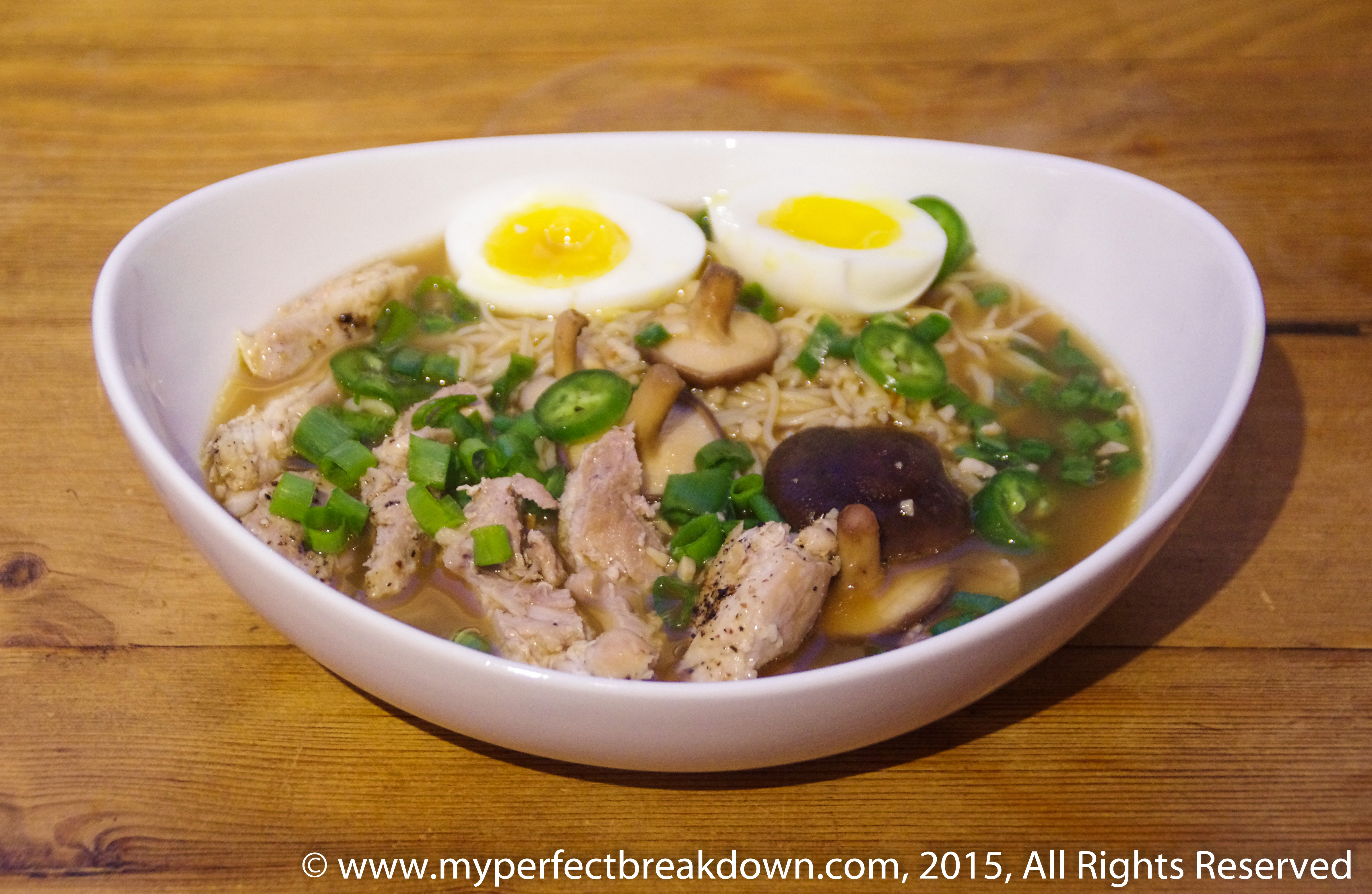Day 270 – April 2, 2015: Tonight I made my first ever home-made Ramen. Gluten-free Ramen noodles with oven roasted chicken, soft boiled egg, fresh shiitake mushrooms, scallions and jalapenos. It was delicious!!
