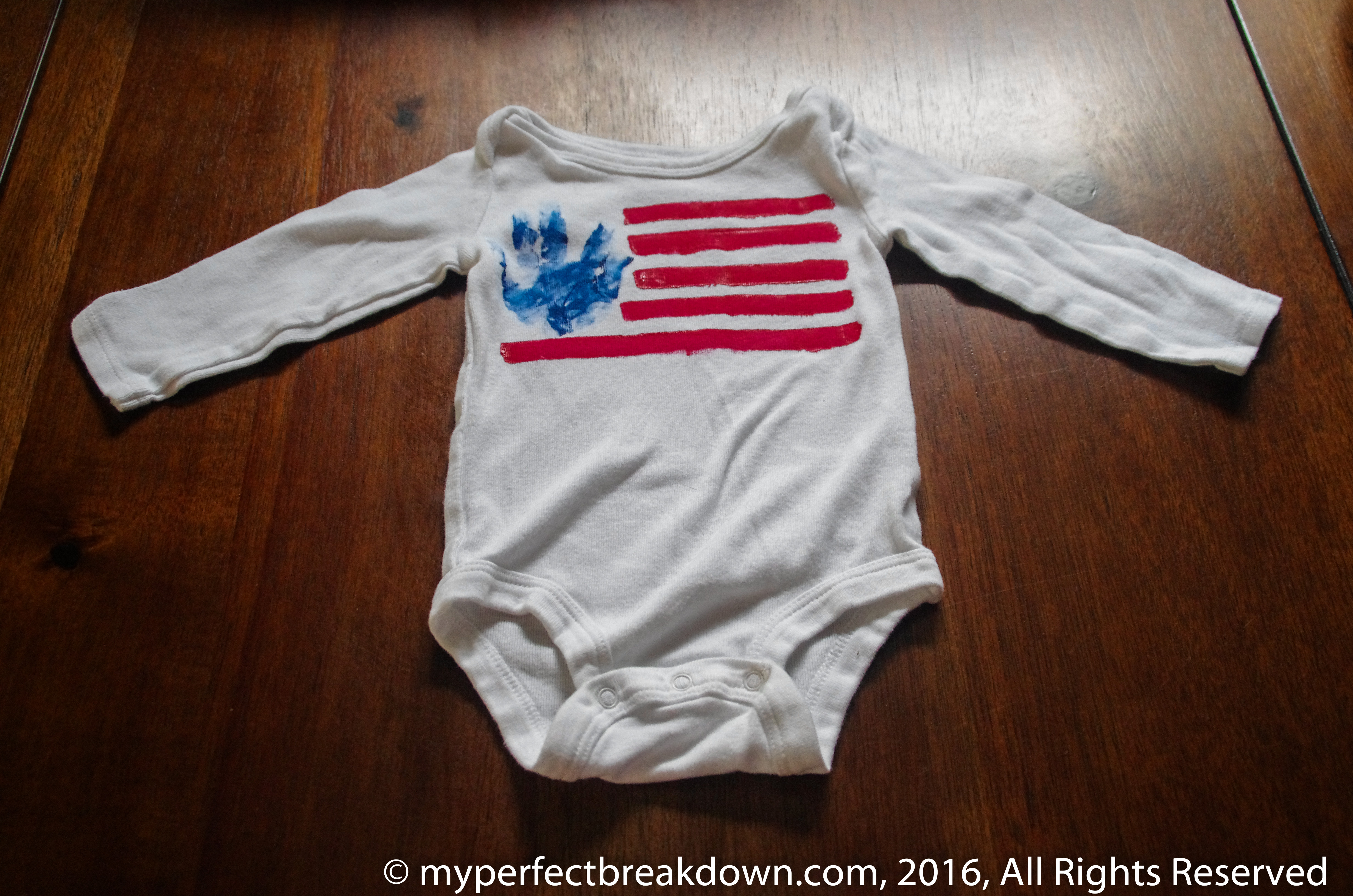 And then, we did something this Mommy never thought she’d do. In an effort to celebrate USA Independence Day, we debated multiple food items, as suggested to me from some of my USA friends – like this one or this one. For two armature foodies, you’d think we would have jumped right into creating a USA themed dish or two. But, we decided Baby MPB couldn’t enjoy them this year. So, we booked marked the websites for next year and decided to do something completely out of my comfort zone – we made a craft! As suggested to me, I scoured Pinterest and found this homemade USA onesie. We decided to attempt our own. And while not perfect or nearly as good as the inspiration onesie, I think we did an alright job. In fact, I think our USA onesie is way cuter then the store bought Canadian one.