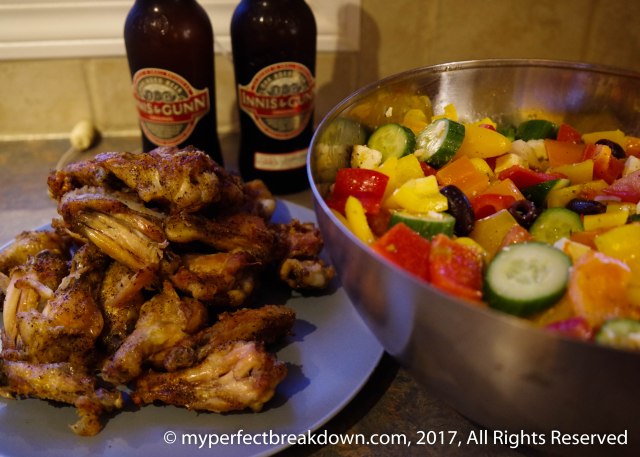 Day 1: September 1, 2017: Salt and pepper baked wings and Greek salad. The Greek salad became lunch for a few more days.