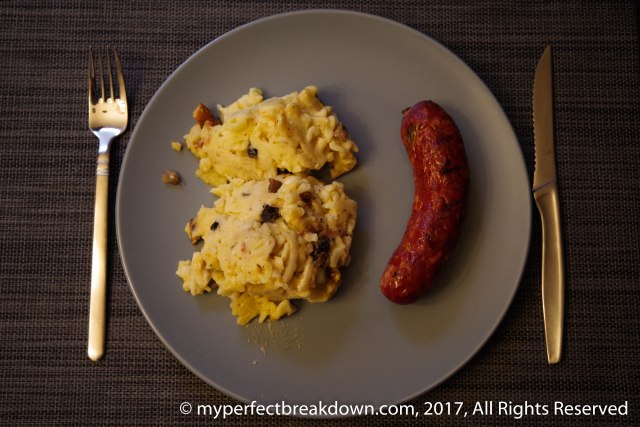 Day 13: September 13, 2017: Left-overs! Mr. MPB suggested turning the mac n’ cheese into quiche. To which I responded, that sounds horrible, I’ll pass. So, in the end, we went with left-over mac n’ cheese with a jalapeno and cheddar venison sausage.