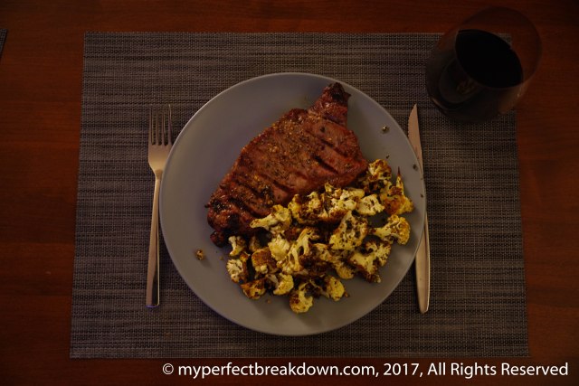 Day 16: September 16, 2017: BBQ steak and roasted pesto cauliflower (1 head of cauliflower cut up, 3 tbsp. of pesto and 1/3 cup olive oil – cook in the oven or on the BBQ until golden – about 20-30 minutes). With red wine of course.