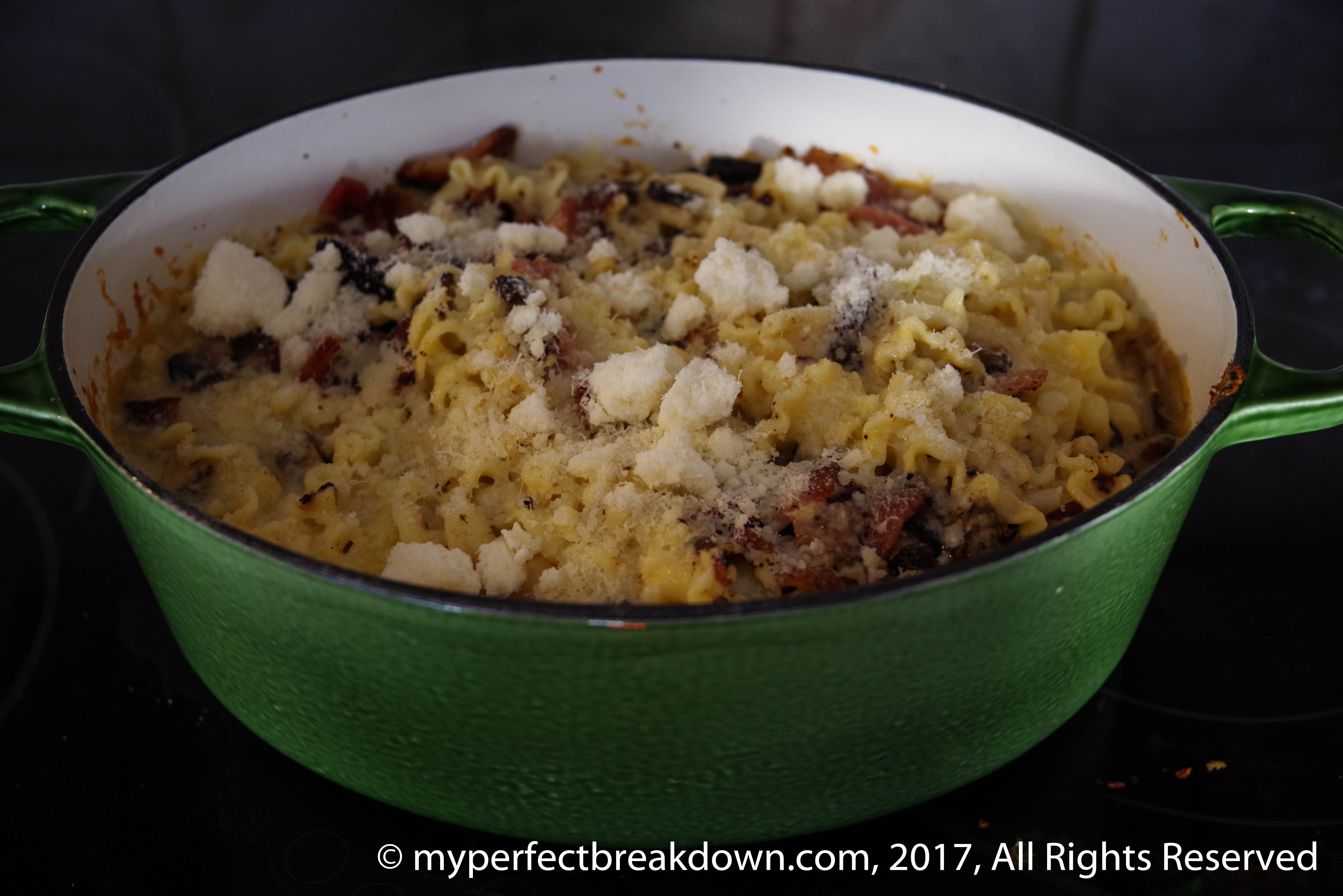 Day 12: September 12, 2017: As I feel as though summer has officially ended given a drastic drop in our temperatures, we made grown-up macaroni and cheese. We boil up some pasta. Our standard recipe is to mix together 1 tbsp. of butter, 2 tbsp. of flour on low heat until soft, then add 1.5 cups milk and 0.5 cup blue cheese, 1 cup goats cheese, 1 cup cheddar, 1 cup brie, a dash of salt and a dash of pepper. We never actually use exactly these cheeses or these proportions – we just whatever is in the fridge and guesstimate the proportions. And we also added bacon and portabella mushrooms, again just what we had on hand. And, as an added bonus, Little MPB absolutely loved it!