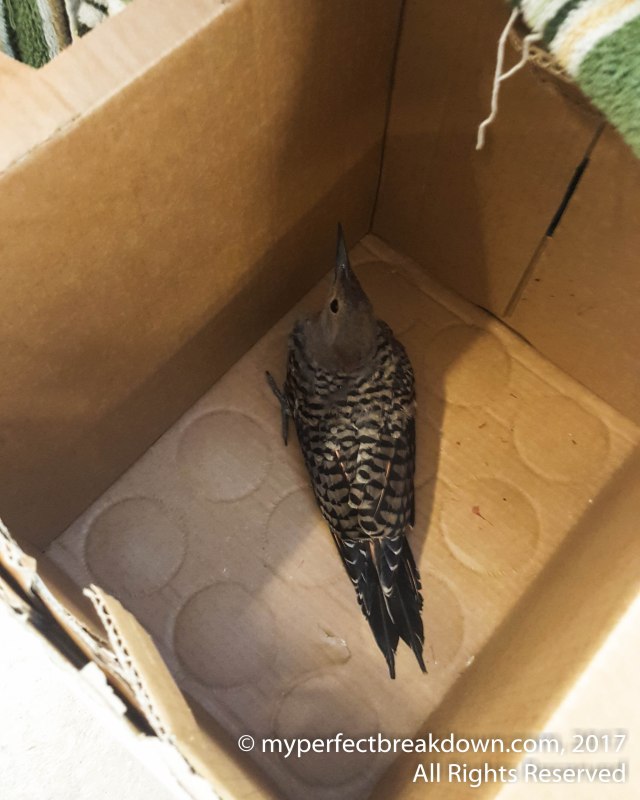 Ultimately, she didn’t die under my watch and she’s now with the emergency vet. I’m told that they suspect Flick has a broken wing, and the vet will do an initial check and the wildlife rescue will come pick up Flick and care for her until she is able to be released to the wild. I’ll probably never hear about Flick’s recovery. But, I suspect every time I see a Northern Flicker, I’ll think about Flick and hope she’s flying freely with her birdy friends.