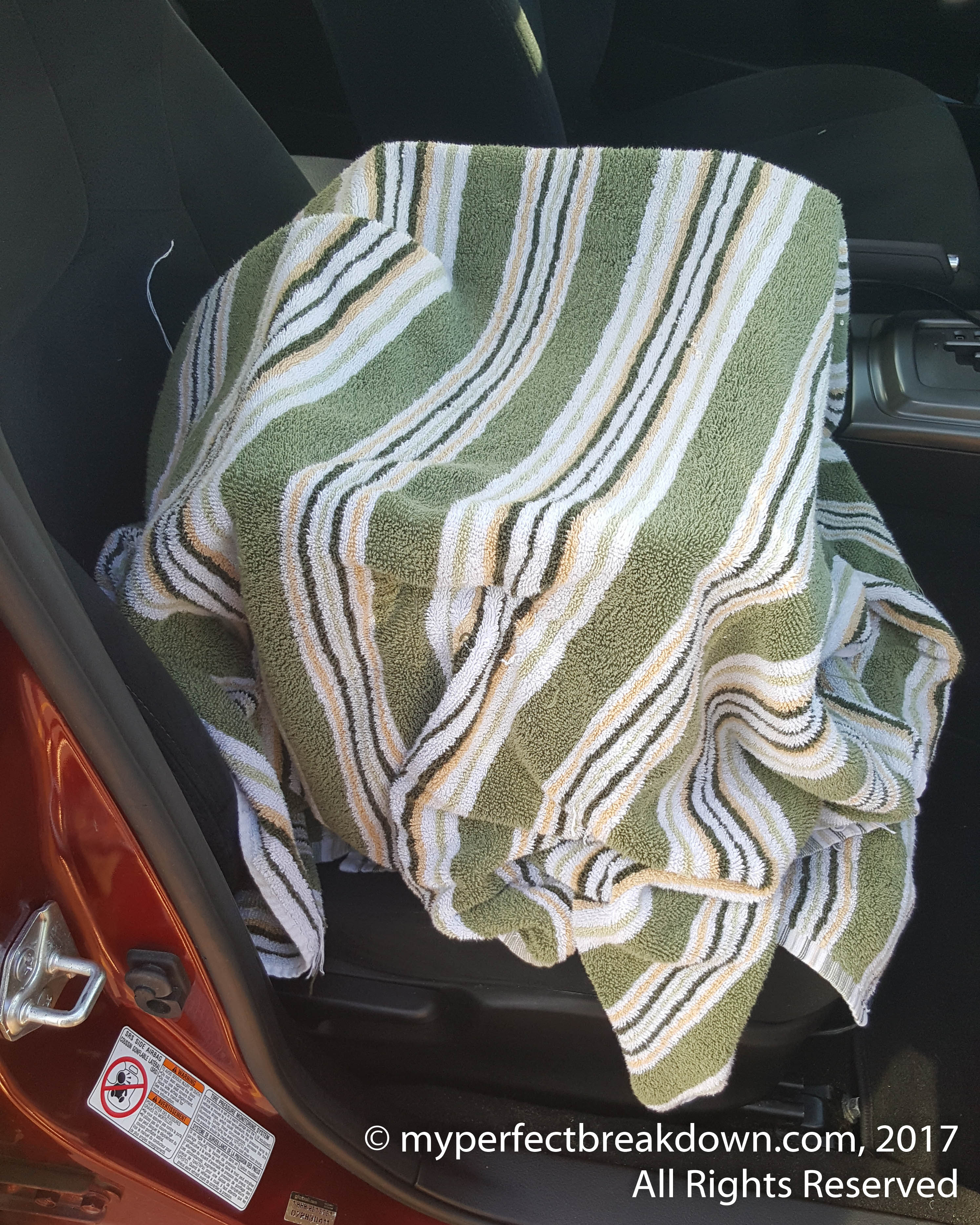 I got home and dropped off the dog. Mr. MPB shoved some of her drugs into her and we began emptying out my car for the trip to the de-puking company – remove the car seat, the stroller, a spare sweater, 3 pairs of work shoes (who has 3 pairs of work shoes in their car?) and my winter emergency kit (I guess I’ve just been extra prepared for an unexpected snowstorm this summer).
